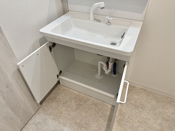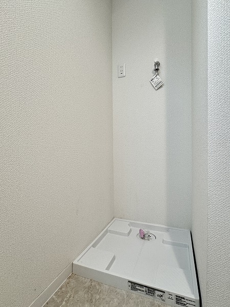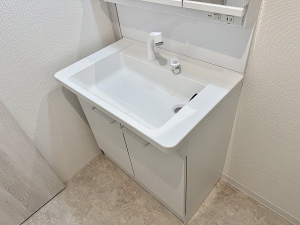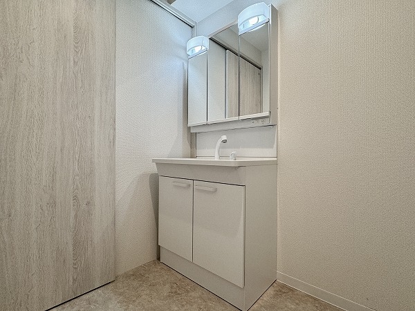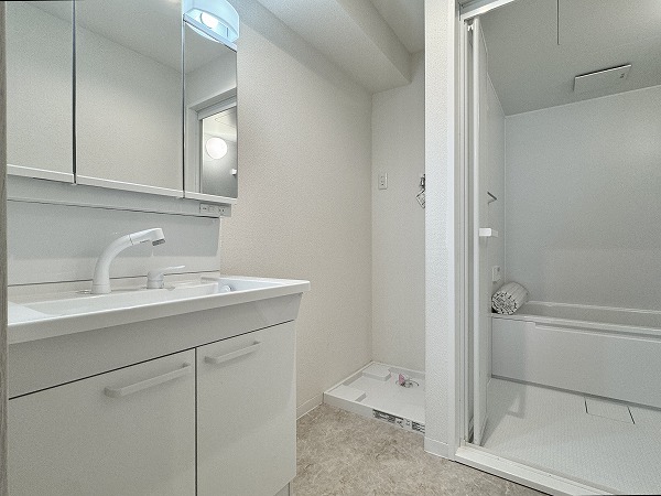 パウダールームはホワイトで清潔感あふれる空間。人気の3面鏡付き洗面化粧台にはミラーキャビネットが備わり、歯ブラシや化粧品の収納もスッキリ。洗濯機置き場とバスルームがひとつにまとまった効率的な配置で、家事や身支度もラクラク✦