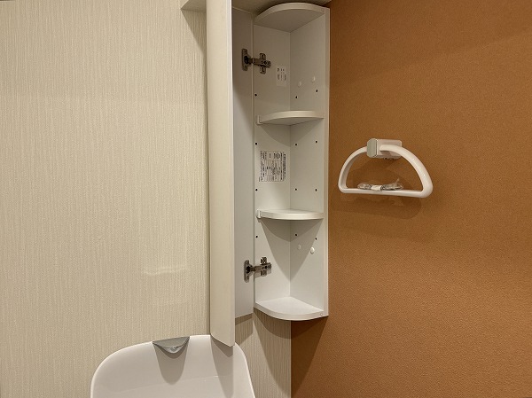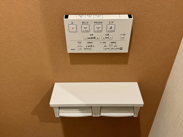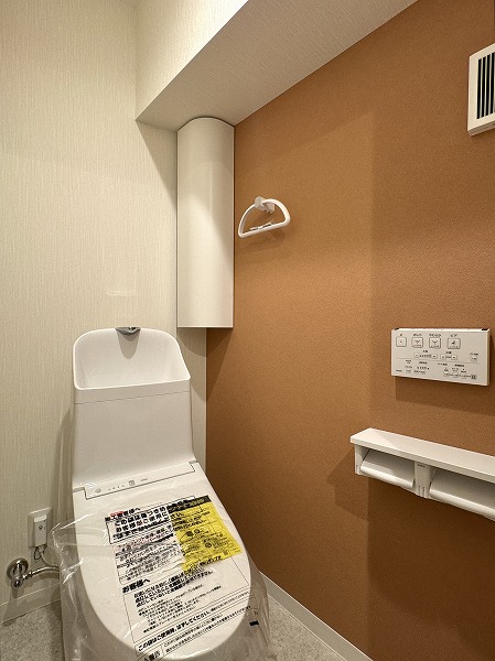 独立したトイレは、オレンジのアクセントウォールで明るくポップな雰囲気。新規交換済みで清潔感があり、温水洗浄便座が備わっています。トイレットペーパーなどは備え付きの収納へどうぞ!