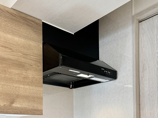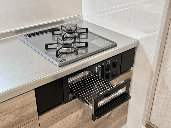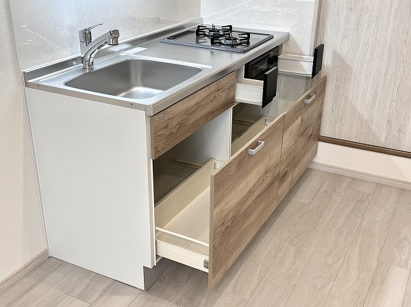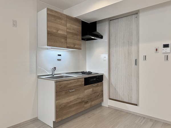 キッチンは壁付けタイプで、木目のデザインがナチュラルな雰囲気を演出。キッチン横の扉からはパウダールームに直接アクセスでき、洗面化粧台やバスルーム、トイレへスムーズに移動可能です。料理中も水回りが近く生活動線が考えられていますよ。