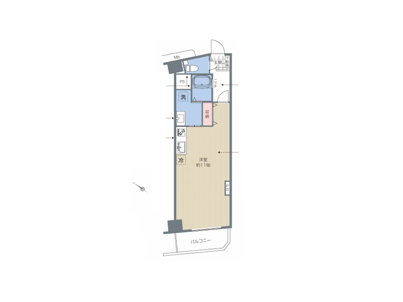 南西向きのメインルームは約11帖、縦長の造りで視覚的にも開放感があります。ゾーニングがしやすく、自分好みの居心地のいい空間を作れそう。ライティングレールを活用すれば、光の演出で一気におしゃれな雰囲気に✦