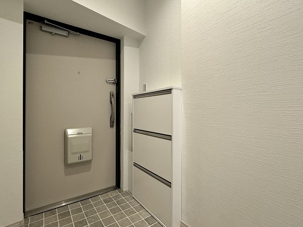 玄関はシンプルな造りで、コンパクトなシューズボックスが設置されています。靴の量を絞れば空間を広く使えるのが魅力。小さなトレーや壁掛けフックを活用すれば、鍵や小物もすっきり片付き整理上手な玄関に仕上げられますよ。
