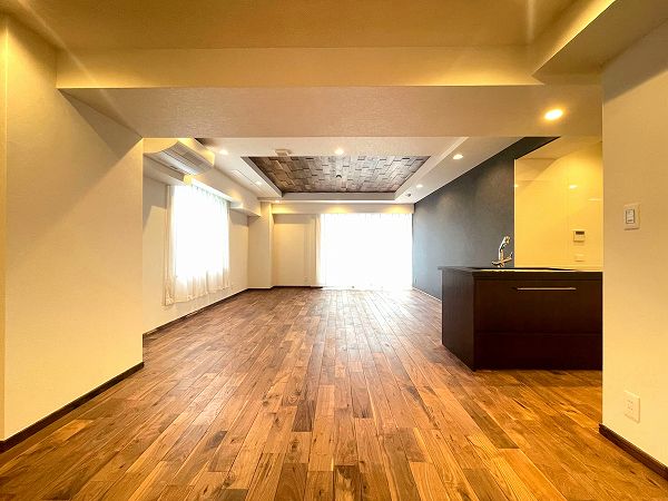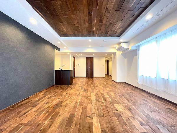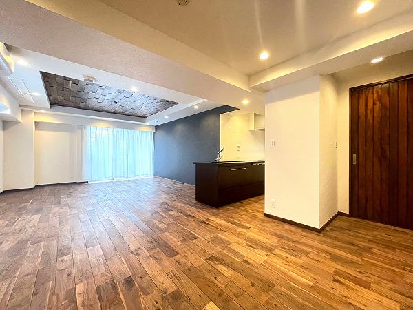 今回のお部屋は1階部分、専有面積105㎡超の2LDK。スケルトンリノベーションにより一新された室内は、素材の質感と余白の美しさが共存する上質な空間に仕上がっています。約25.3帖のリビングダイニングは、無垢ウォルナットの床がやさしく足に馴染み、ブラックのアクセントウォールが空間を引き締めることで、落ち着きのある“大人のリビング”に✦