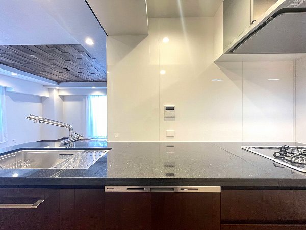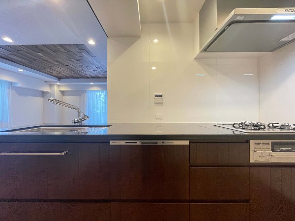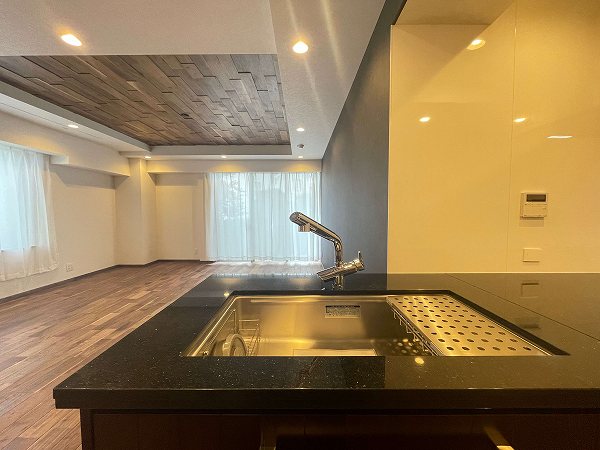 ブラックのアクセントウォールと天井の木目がモダンな印象を際立たせるリビングダイニングキッチンは約25.3帖のゆとりある空間。フローリングには天然無垢ウォルナット材を採用し、自然素材ならではの質感と温かみが感じられます。衝撃に強く耐久性にも優れているため、長く心地よく使えるのも嬉しいポイント。