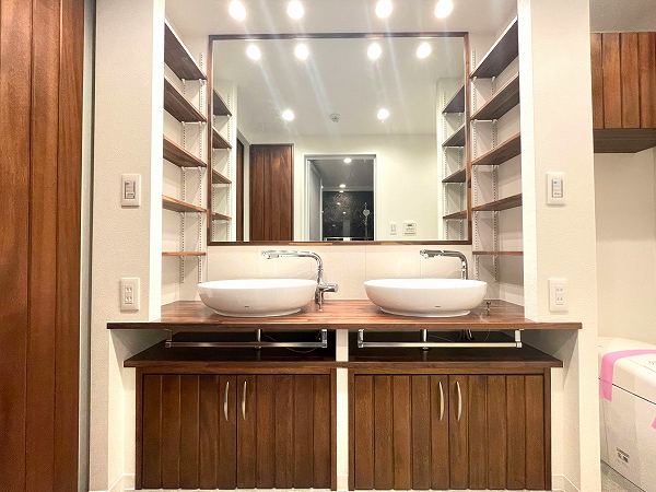 木目の美しさが際立つパウダールームは、上質なホテルを思わせるような洗練された空間。ベッセルタイプのダブルボウル洗面台を採用し、2人同時に使えるゆとりのあるレイアウト✦朝の時間も慌ただしさを感じにくく、快適に1日をスタートできそう!
