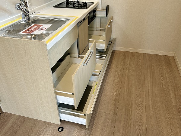 壁付タイプのキッチンは、調理に集中しやすいだけでなく、匂いや煙が広がりにくい点も日常に嬉しいポイント。収納スペースも豊富に確保されているため、調理道具や食材をすっきりまとめることができ、いつでも気持ちよいキッチンスペースを保てます。