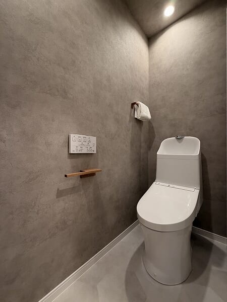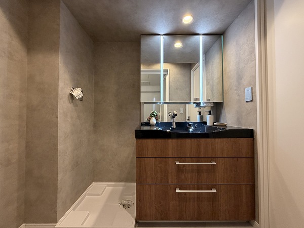 グレージュのクロスが柔らかく包むサニタリールームは、深みのあるブラウンとブラックで仕上げた洗面化粧台がアクセントとなり上質な雰囲気を演出しています。3面鏡タイプで身だしなみのチェックもスムーズ◎照明が顔まわりをしっかりと明るく照らし、朝の準備が一段と快適になります。