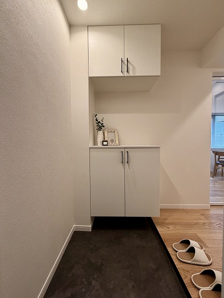 玄関には上下にシューズボックスが配置され、季節ごとの靴をすっきり収納するのにとても便利。中央のカウンターは鍵置き場はもちろん、季節の花や小物を飾るスペースとしても活躍します。帰宅時にほっとできる、整った玄関スペースです。