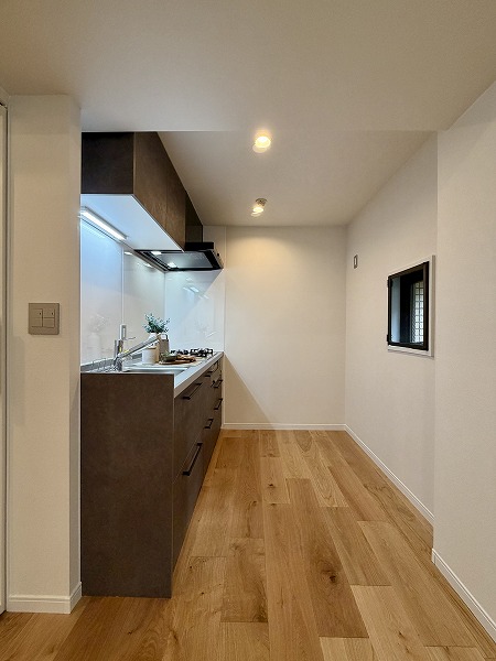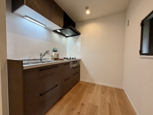 壁付タイプのキッチンは、調理に集中しやすいだけでなく、匂いや煙が広がりにくい点も日常に嬉しいポイント。収納スペースも豊富に確保されているため、調理道具や食材をすっきりまとめることができ、いつでも気持ちよいキッチンスペースを保てます。