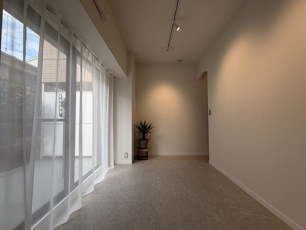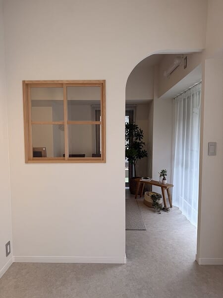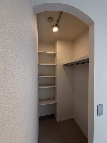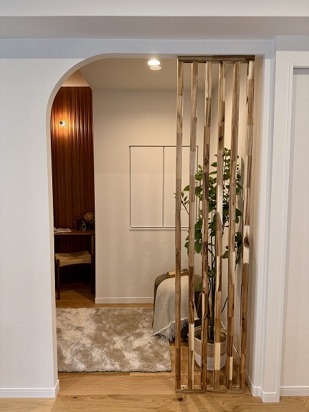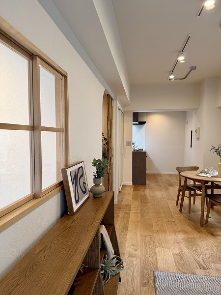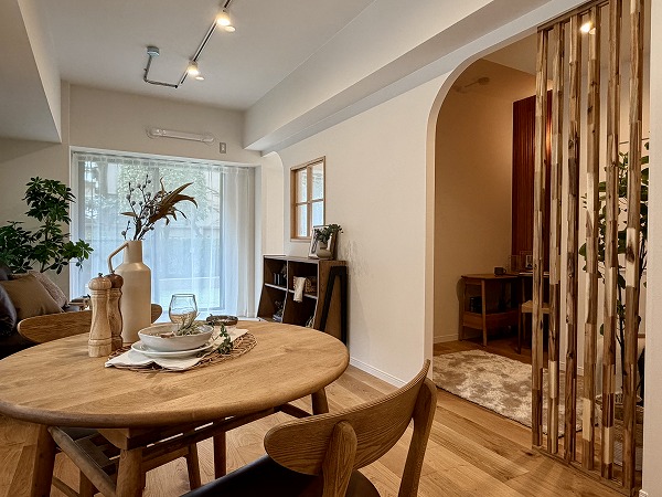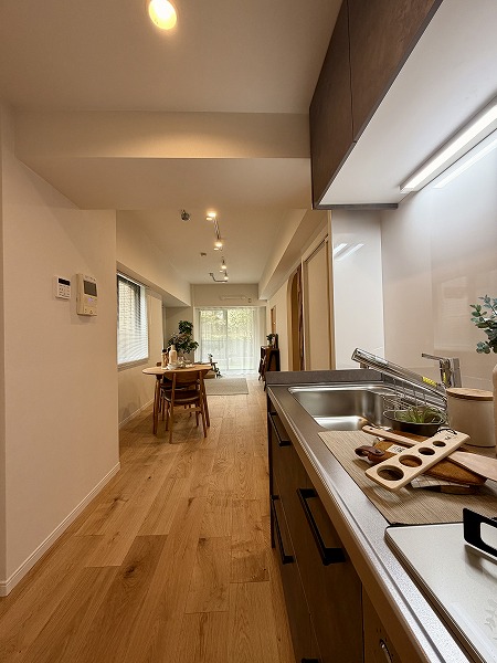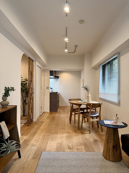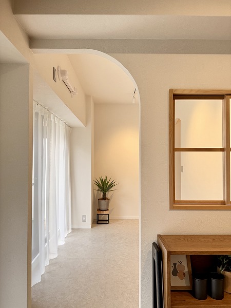 約12.5帖のLDKは、横に長く伸びるスタイリッシュな間取りが印象的。視線が奥まで通り、空間の広がりを強調します。2方向から光が注ぐことで室内全体が柔らかく照らされ、天井の高さと相まって開放感をより一層引き立てていました。また、各洋室への入口にあえて扉を設けないデザインで住まいに軽やかな抜けを生み、洗練された雰囲気を演出していますよ。