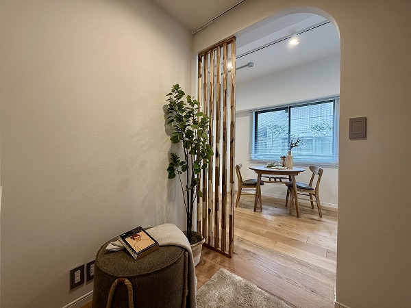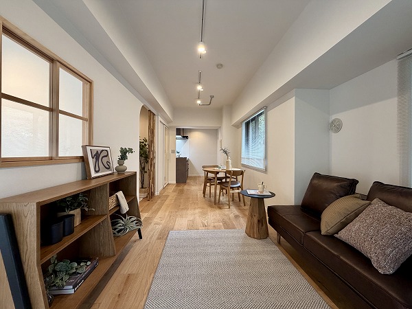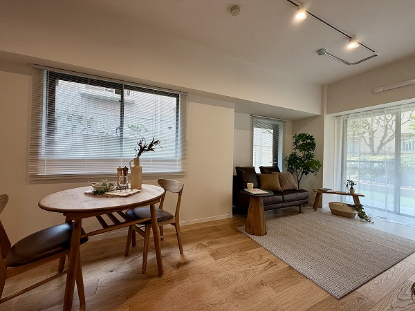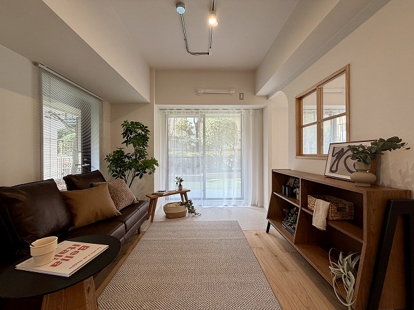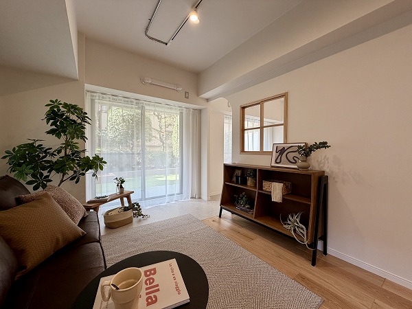 リノベーションが施された1階の住まいは、木目調をふんだんに取り入れたナチュラルモダンな空間。専有面積49.88㎡の2LDKで、南西向きの角住戸ならではの明るさと専用庭やテラスが加わることで、面積以上のゆとりを感じられます◎室内に足を踏み入れると、木のぬくもりが自然と心をほどいてくれる、そんな温かさに満ちた一室です。