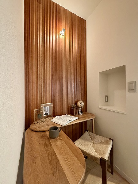 約2.8帖とコンパクトながら、ウッドデザインのアクセントウォールが印象的な一室。落ち着きと華やかさを併せ持つ雰囲気で、在宅ワーク用の書斎や趣味のスペースとしてぴったり。小さいからこそ集中できる、自分だけの“こもり部屋”に最適です♪