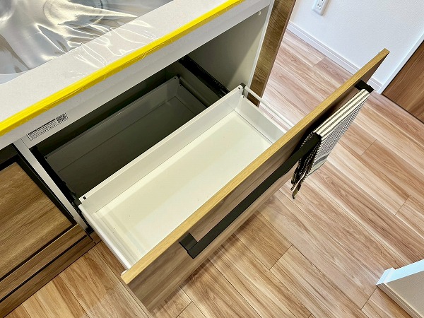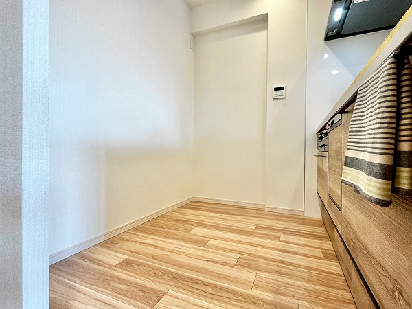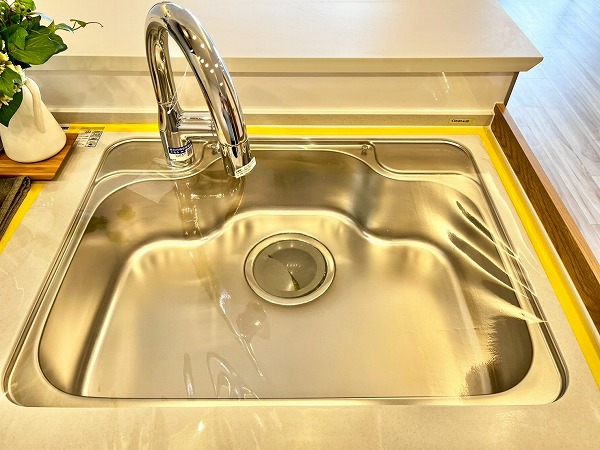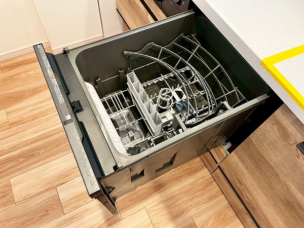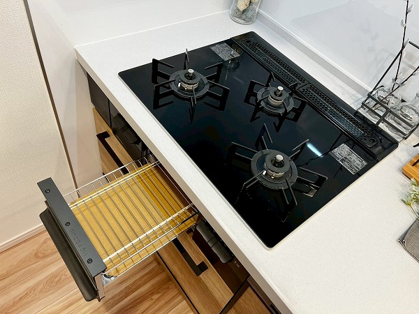 スペースが確保され、動線周りに使いやすさを感じるキッチン。忙しい朝や夕食後の時間など、複数人がキッチン回りを使用しても窮屈さを感じない造りが魅力的です。広々としたシンクは水撥ねしにくく、調理もスムーズに。食洗機と3口コンロまで兼ね備えた、機能的なキッチンです。