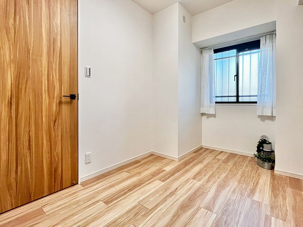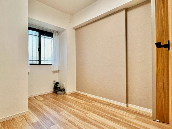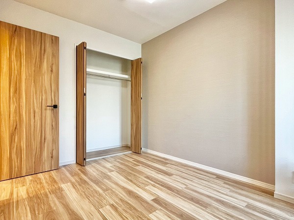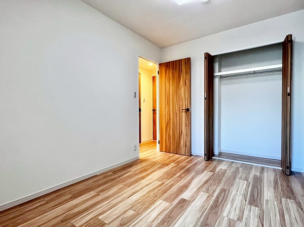 廊下から出入りできるこちらの洋室はおよそ6帖あり、ベッド以外にもテーブルやチェアを置いて余暇活動を楽しむことのできる余白がありました。全ての居室に窓とクローゼットが付いており、メインルームでの家族の時間と個人の時間を両立できる、メリハリある暮らしが叶います✧