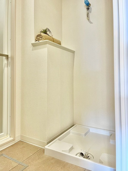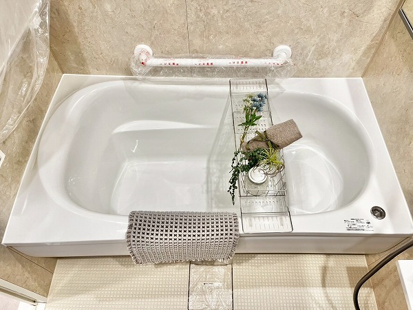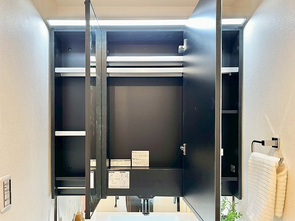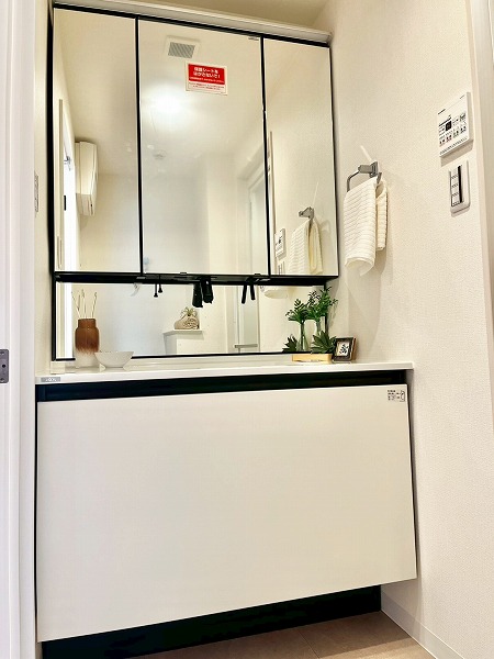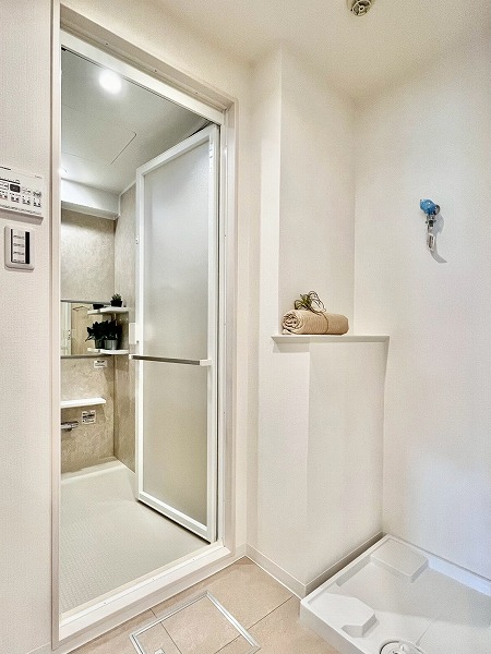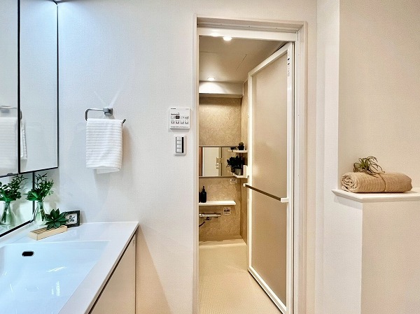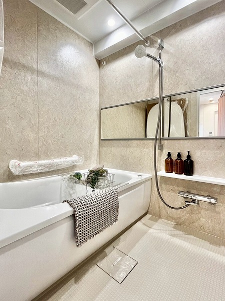 新規交換を経てピカピカに生まれ変わったバスルームは、ワイドな鏡と柔らかい色遣いによって開放感のある空間に仕上がっています。鏡下の棚は家族それぞれのシャンプーやボディソープを置いておけるだけの広さがあり、便利。追い焚き機能&浴室乾燥を備え、忙しい毎日に寄り添う機能が満載です。