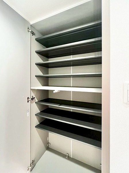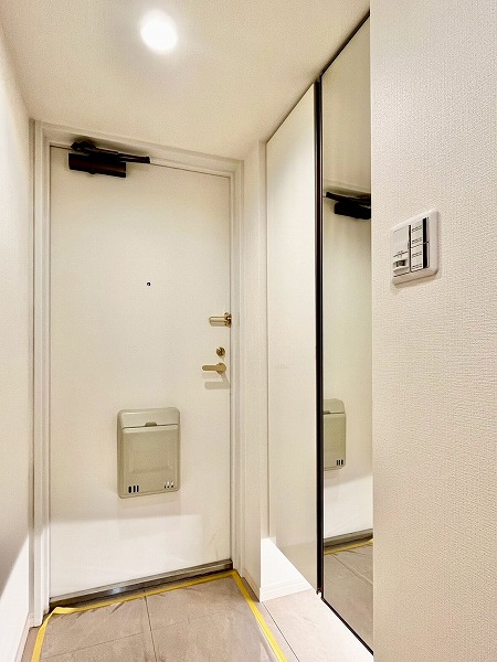 ホワイトで統一された玄関ポーチ。ゴールドの美しいドアノブのしつらえや、足元の柔らかな照明に品と洗練を感じます。高さのあるミラーによって、お出かけ前に全身の身だしなみを確認出来て便利ですね。裏はシューズボックスになっており、家族の靴を段ごとに分けて収納しておけます。