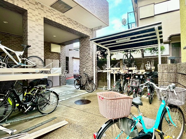 建物右部から出入りできる屋外駐車場がありました。1台ごとにエリアが区切られ、出し入れのしやすい造り。駐車場内には自転車を停めるスペースも設けられていました。こちらは屋根付き・屋根ありに分かれていたのようなので、入居時に相談してみては✧