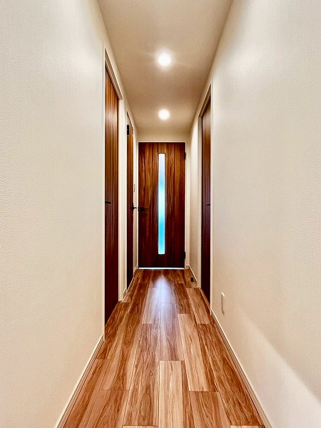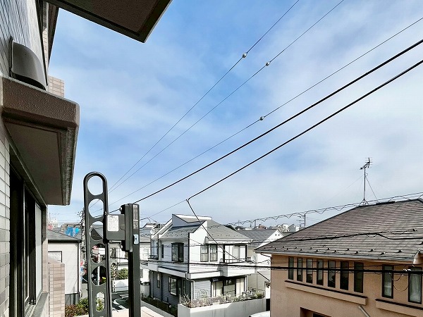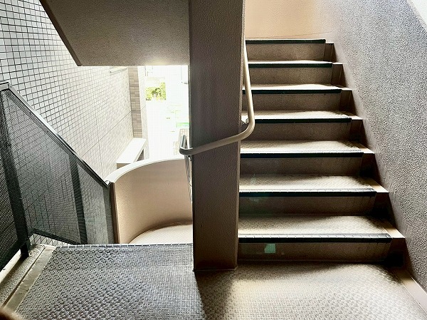 エレベーターを下りると、外廊下に沿って各戸の扉が並んでいます。手摺付きの外階段もあり、有事の際はもちろんのこと混み合う朝の時間帯にもお使いいただけますよ◎