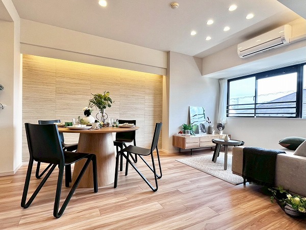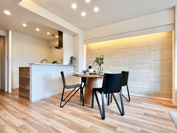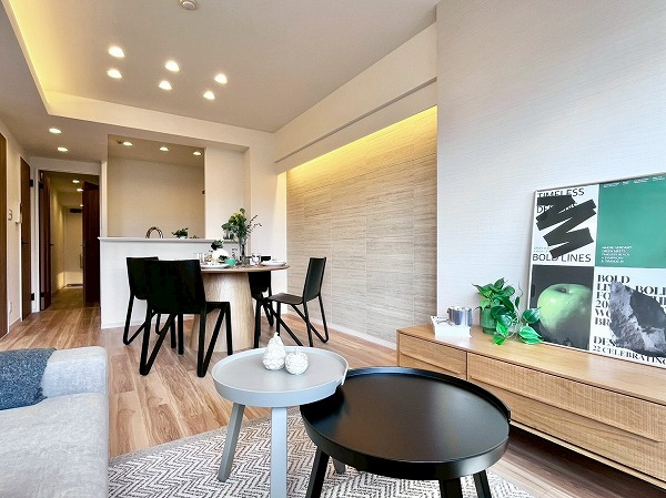 ファミリーでの住まいにぴったりな3LDKのお部屋は、木目を基調とした温かさを大事にしながら、所々にあしらわれたブラックの建具や間接照明のしつらえに洗練を感じる住空間。家族そろっての落ち着いた団欒のひとときに寄り添います。家具付きマンションにつき、お引っ越しでペースを乱されることなく、すぐに快適な生活を始められますよ✧