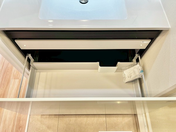 パウダールームにはリビング内から出入りすることができ、家族の動きや様子を感じながらの生活が叶います。バスルームに加えて洗面化粧台・洗濯機置き場が集合することで、家事動線が集約された配置が使いやすそうです。収納はミラー裏や洗面台下に加えて洗濯機置き場の付近にカウンターが設けられ、洗濯洗剤やフレグランスなどを置いておくのにぴったりです。