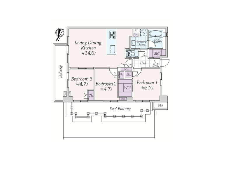 東・北向きの2面バルコニーはそれぞれ陽当たり&風通し良好。洗濯物を干す実用的な用途はもちろん、外の空気を感じながらひと息つく場所としても活躍。角住戸ならではの抜け感もあり、日常の中に心地よい余白を生み出してくれます。