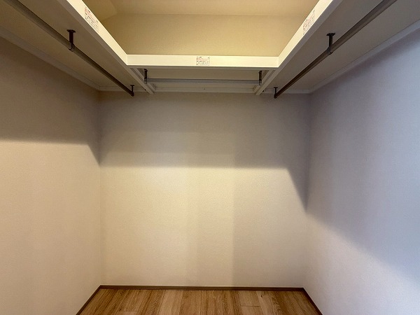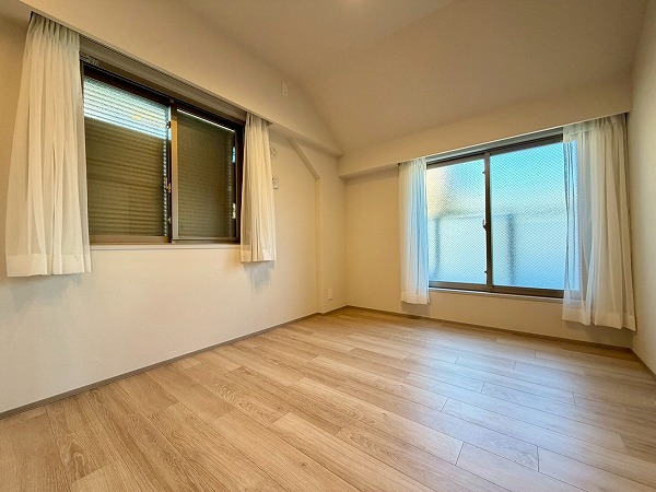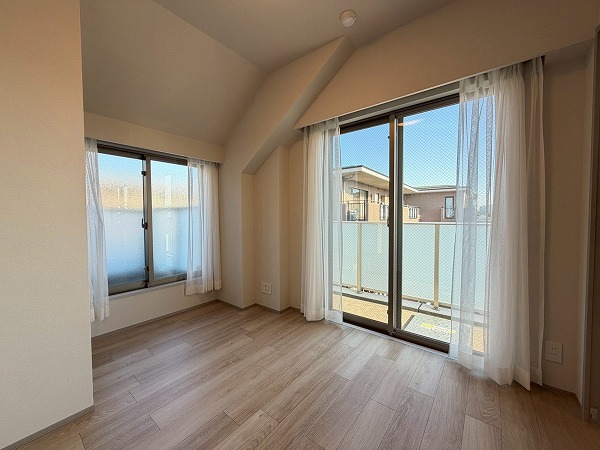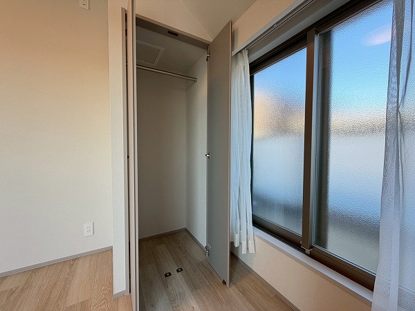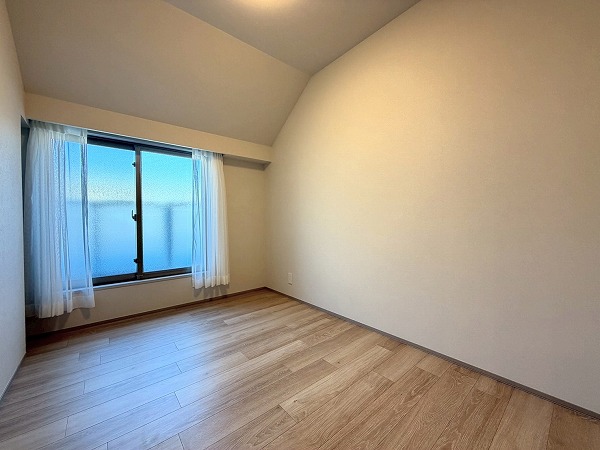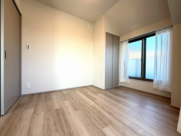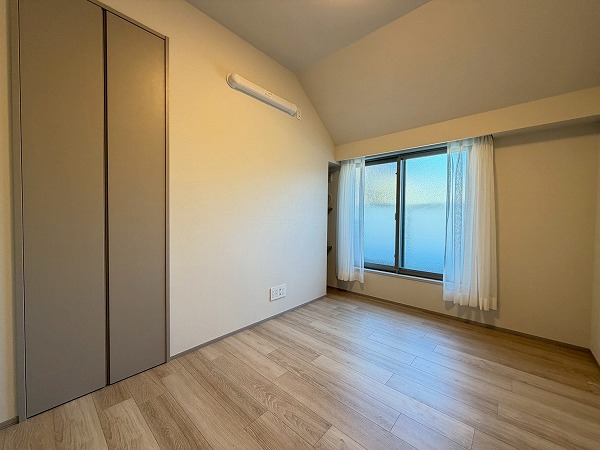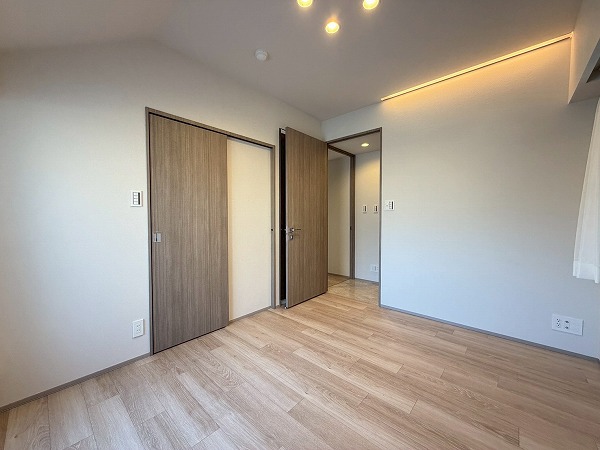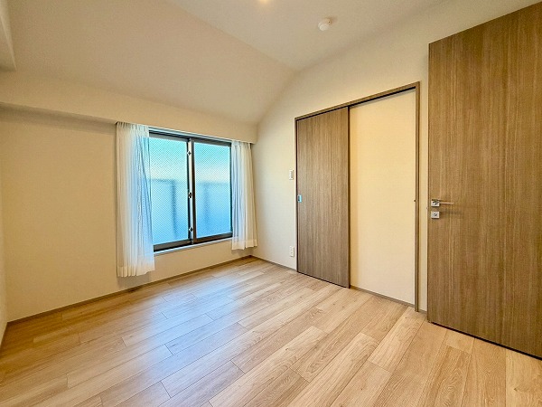 約5.7帖の洋室は、主寝室として使いやすい広さが確保されています。ベッドを配置しても動線にゆとりがあり、落ち着いて過ごせるプライベート空間に。大容量サイズのウォークインクローゼットも備わっているため、衣類や生活用品をすっきり収められます。