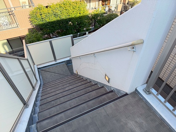 アプローチは段差を活かした奥行きのある設計で、街と住まいをやわらかく切り分けています。ゆったりとした階段に加え、スロープも設けられており、ベビーカーやキャリーケースの移動もスムーズ。植栽と外構が丁寧に整えられ、外部からの視線をほどよく遮りながら、落ち着いた雰囲気を演出しています。