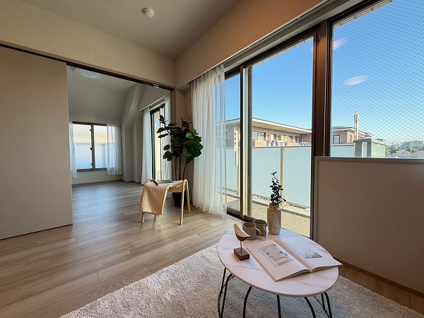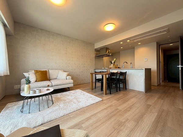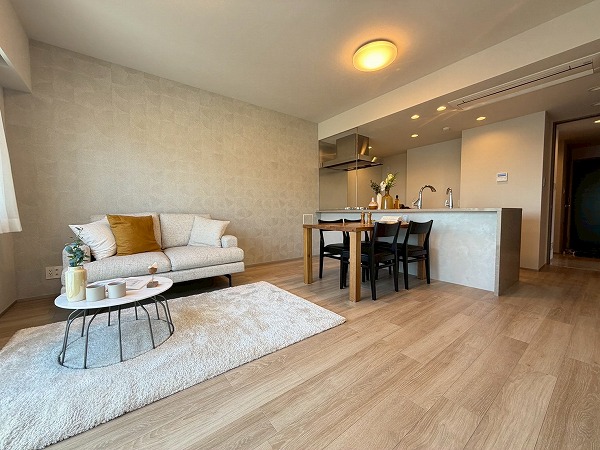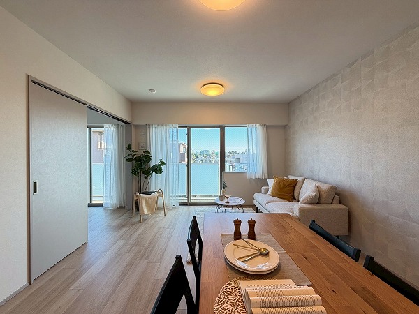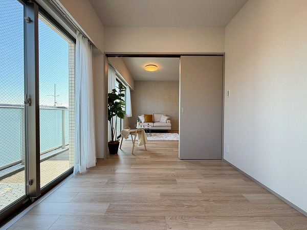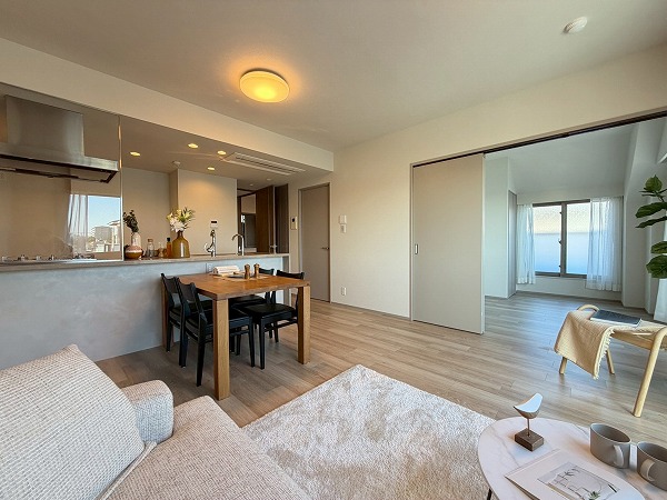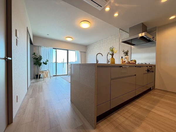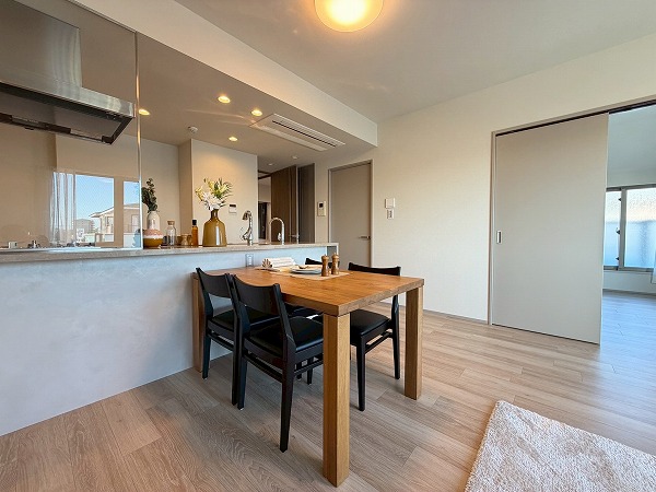 メインとなるのは、約14.6帖のリビングダイニングキッチン。床暖房が設置されており、冬場も足元からやさしく暖かいのが魅力。バルコニーに面した開口部からは光が入り、角住戸ならではの明るさと開放感が感じられます。家族が自然と集まり、穏やかな時間が流れる空間です。