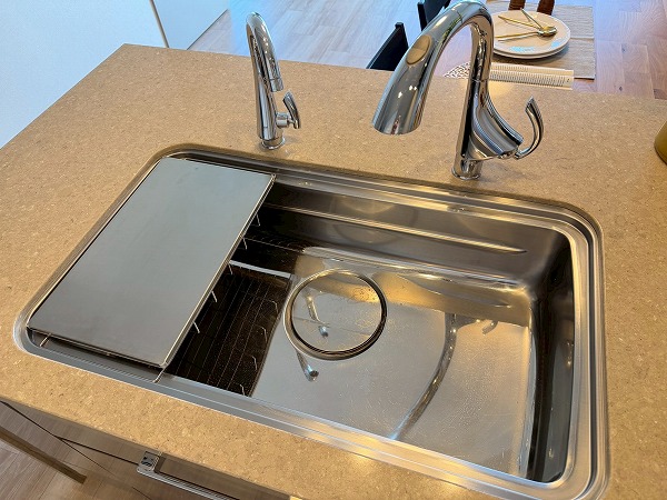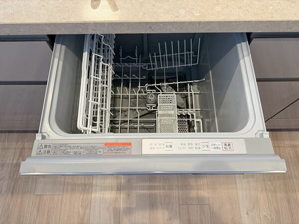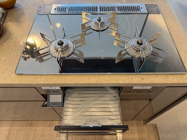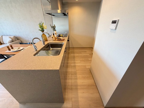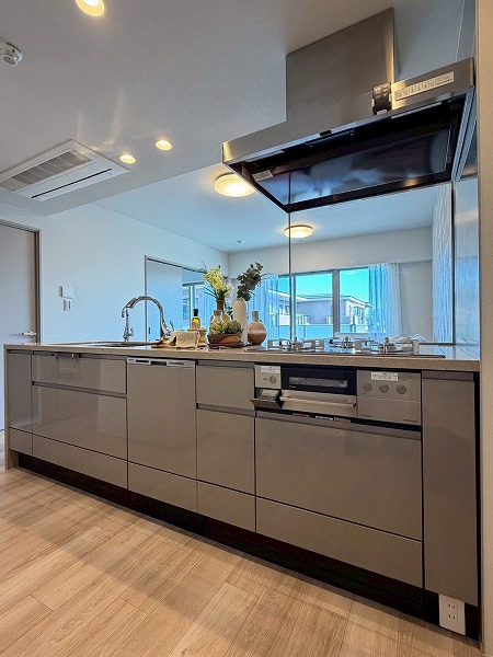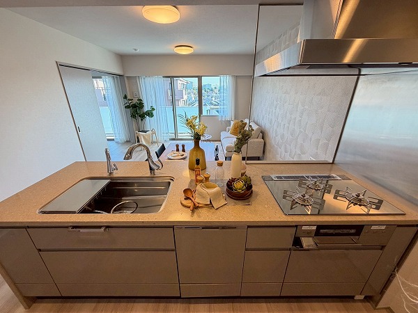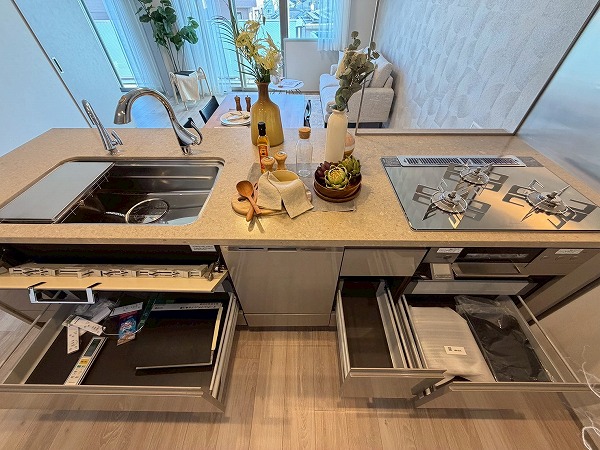 リビング全体を見渡せるカウンタータイプのシステムキッチン。食洗機や3口コンロを備え、調理から後片付けまでスムーズに進められます。作業スペースも確保されており、複数の工程を同時に行いやすい点がポイント。収納も充実しているため、調理器具や食材をすっきりまとめられ、日々の家事を快適に支えてくれます。