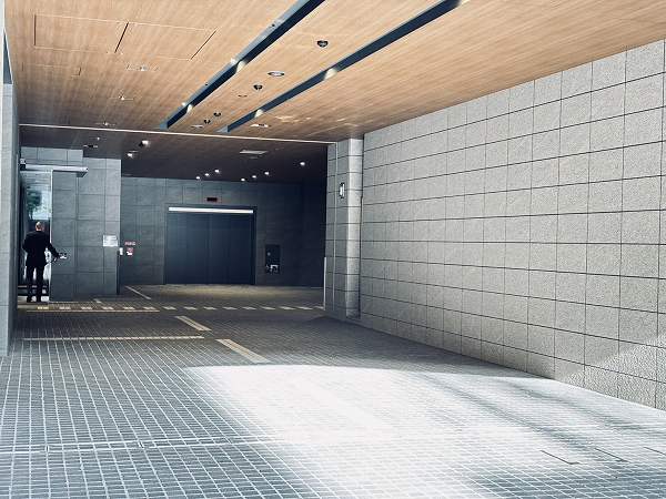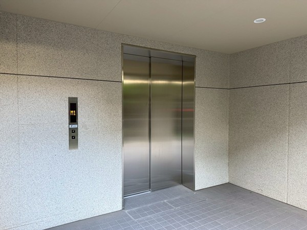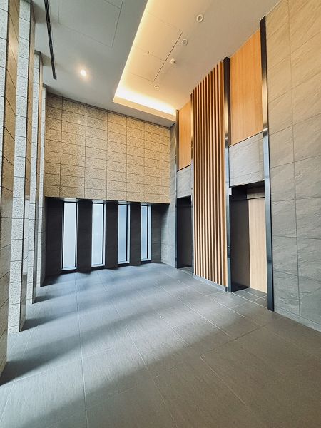 エレベーターを降りるとホテルライクな内廊下が広がります。静かで上品な空気に包まれ、住戸へ向かうわずかな時間さえも穏やかに感じられました。エレベーターは複数基用意されており、日常の動線にも余裕が感じられます。