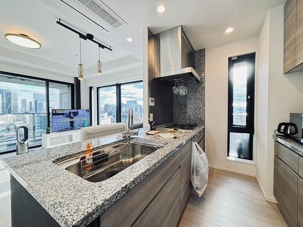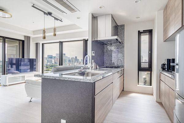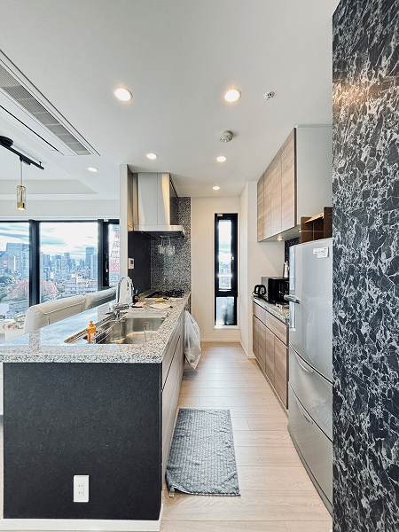 室内に入った瞬間、まず感じたのは光の入り方の綺麗さ✦16階・南東角住戸という条件が、そのまま空気感に表れている印象です。約13.0帖のリビングダイニングキッチンは南西・南東の2方向から光を受け止め、天井高2.62mの高さも相まって数字以上の伸びやかさ。視線の先には「東京タワー」を足元から望む景色があり、これが日常になる贅沢さを思わず想像してしまいました。