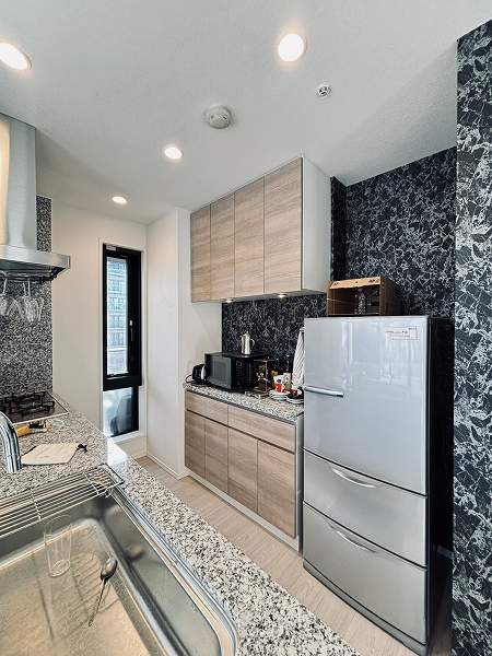 約3.2帖のキッチンスペースは、ペニンシュラタイプ。グレーのキッチンがホワイトの内装の中で程よいアクセントとなり、空間にメリハリを生んでいます。インテリアの一部としても馴染みやすく、毎日の家事時間を穏やかに支えてくれますよ♩