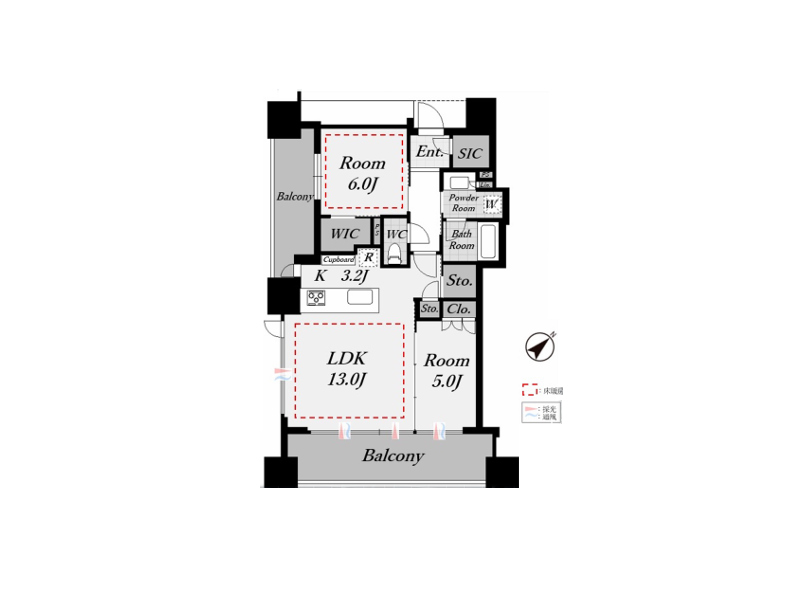 約6.0帖と約5.0帖の洋室はいずれもバルコニーに面した配置で、室内にいながら外の気配を感じられる点が印象的♥約6.0帖の洋室にはウォークインクローゼットを設け、収納力もしっかり確保。プライベート空間として、無理のない使い勝手が考えられていますね。