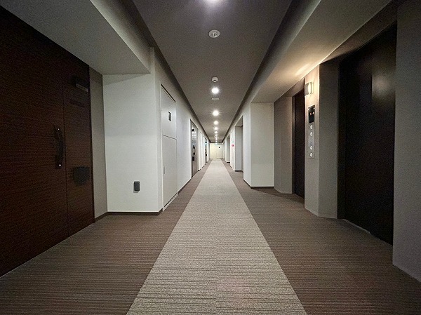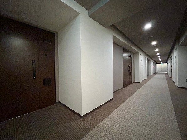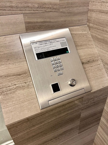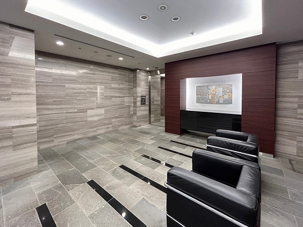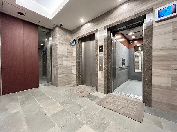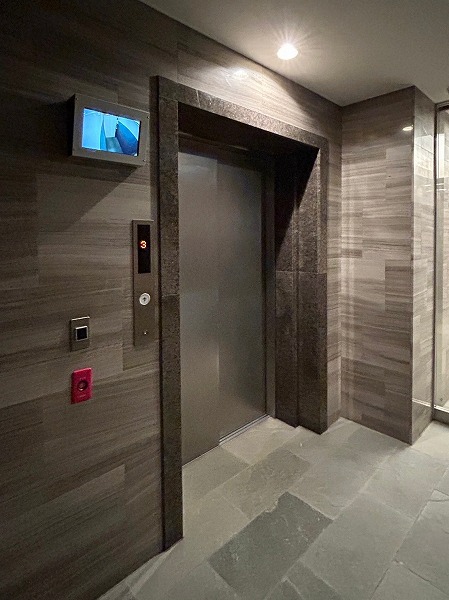 2基のエレベーターが設置されたエレベーターホール。エレベーターはどちらも中の様子が確認できるモニター付きでした。さらに、キーをタッチしないと行き先ボタンを押せないエレベーターシステムを採用し、トリプルセキュリティで安心安全の暮らしを守ります。