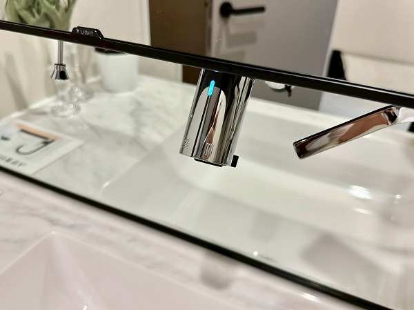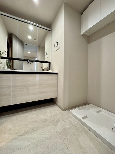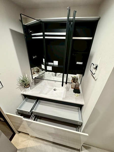 ゆったりとしたパウダールームは柔らかい色の中にさり気なく取り入れられたブラックが締め色となり、洗練された空間に仕上がっています。洗面台には角度が調整できる3面鏡が採用され、身支度をスムーズに行うことができそうです♪