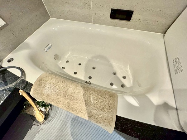 高級感満点な石タイル張りのバスルーム。洗練された印象のシックな配色です✦足を伸ばしてリラックスできる1620サイズ。追い焚き機能が付いているため、ご帰宅時間が異なるご家族がいても気兼ねなくお湯を溜められます。さらに浴室乾燥機を完備しており、洗濯物の乾燥にも◎