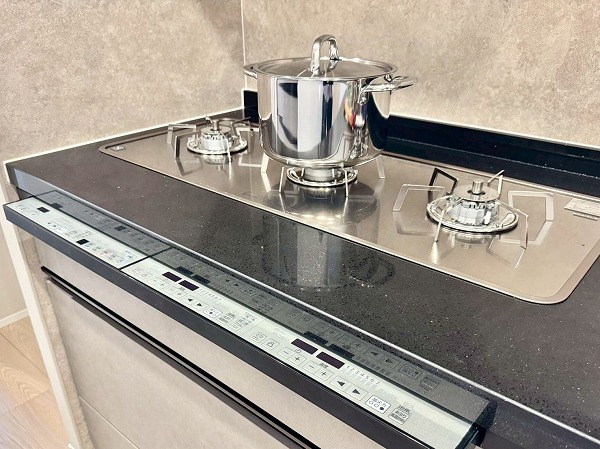 今回のリノベーションによって新しくなったキッチンは、高級感のあるグレーをチョイス。ストーン調のキッチンパネルと、ブラックのワークトップによって、よりスタイリッシュな印象が際立っています✧