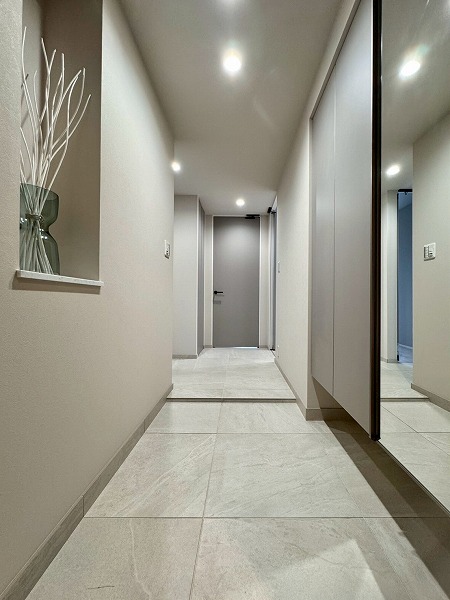 エレベーターは3基。全30フロアとタワーマンションの中ではフロア数が少なめなので、待ち時間は比較的少なく済むのではないでしょうか。落ち着いた色合いで統一され、高級感のある内廊下。カーペットが敷き詰められているため、足音が響きにくくとても静かでした。