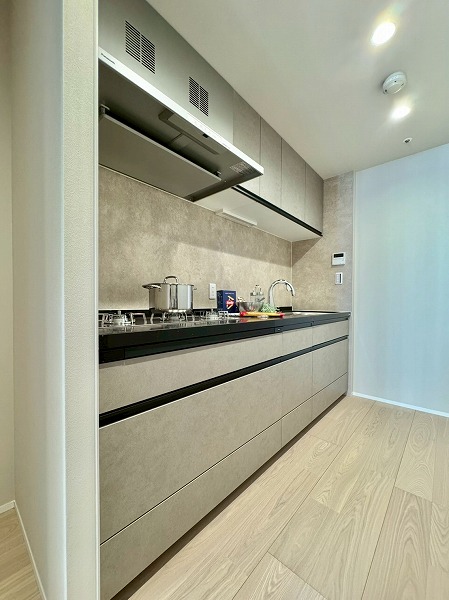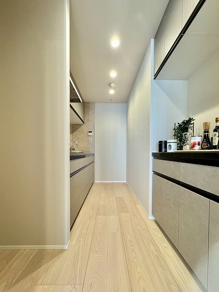 おおよそ3.2帖のキッチンスペースは独立性が高く、扉を閉めるだけで簡単にお子様やペットの立ち入りを制限できます。システムキッチンとカップボードが向かい合わせになっているため、調理中の動線がコンパクト。煙が周辺に広がりづらいのも嬉しいポイントです。