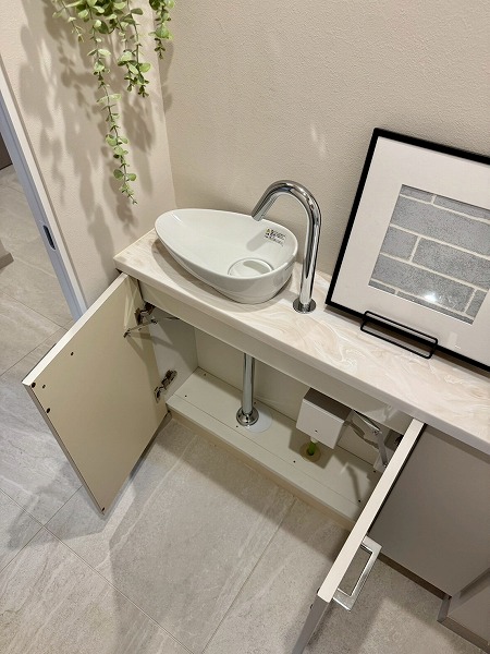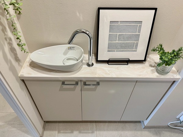 空間がスッキリとして見えるタンクレス型のトイレです。お掃除のしやすさや節水効果の高さも人気の理由。同じ空間内に手洗い場が用意されているため、すぐに手を洗えて衛生的ですね。元々は白とグレーのクールな配色ですが、カラフルなアートを飾ることで華やかな印象に✿