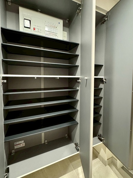 靴はこちらのシューズインクローゼットに収納しましょう!1.1帖ほどのスペースにトールサイズの可動棚が2つ。土間と繋がっているので、お子様の公園グッズを置いておくのにも使えるかもしれません。