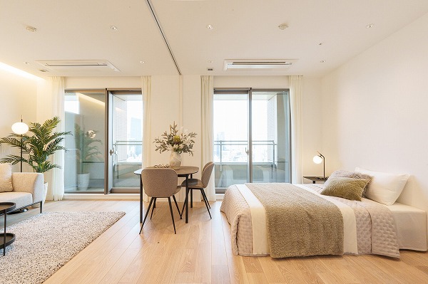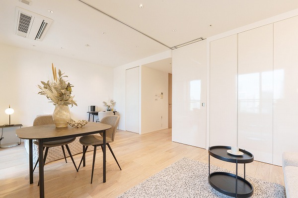 今回ご紹介するのは29階部分に位置する1LDK。専有面積46.62㎡と都心でのシングルライフにゆとりをもたらす広さが確保されています。室内はリノベーション済みで、シンプルながらも素材感にこだわった上質な内装へと一新。ペットの飼育も可能なため、大切な家族とともに新生活を始められる点も魅力。北東向きの住戸のため朝にはやわらかな光が差し込み、日中も穏やかな明るさに包まれます。メインルームと洋室はスライドドアで仕切られており、開放すれば約16.3帖のワンルームのような伸びやかな空間に。家具付きのため、すぐに新生活をスタートできるのも嬉しいポイントです。