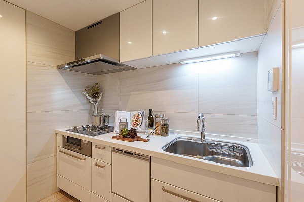 料理好きにはたまらないほど設備が充実したキッチン。約3.8帖のゆとりあるスペースに、同時調理に便利な3口コンロ、グリル、食洗機、浄水器、ディスポーザーを備え、効率的に調理が進みます。ワークトップも広く、盛り付けや調理器具の置き場所に困りません◎