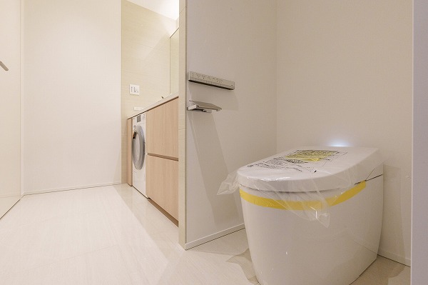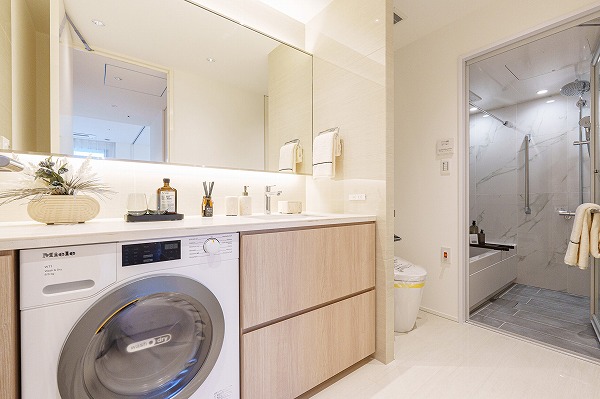 洗面化粧台・洗濯機置き場・バスルームが一か所に集約されたサニタリールームは、動線が短く家事効率も抜群。新しく交換された大きな洗面化粧台は、清潔感のある佇まいが印象的。3面鏡仕様で、朝の準備や帰宅後のリセット時間が心地よく整います。
