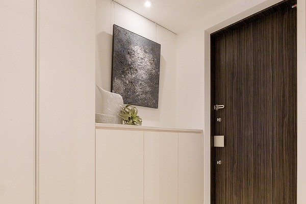 玄関は大理石調の床材とダウンライトの柔らかな光が上品に調和し、住まい全体の雰囲気を引き立てていました。扉を開けた瞬間から洗練された空気を感じられ、大容量のトール型シューズボックスが実用面でも頼れる存在です。