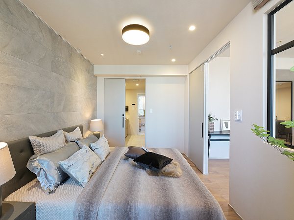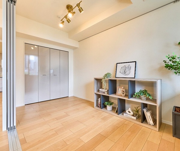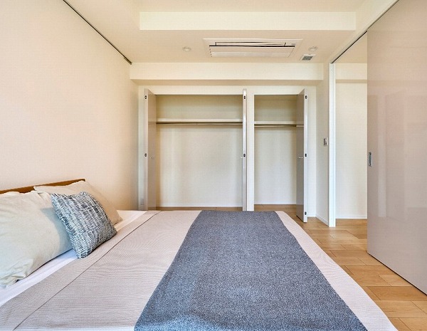 もう1つの洋室は約7.3帖とゆとりがあり、ダブルベッドを置いても圧迫感を感じにくい広さ。壁一面に設けられたクローゼットが収納をしっかり支えます。ビルトインエアコンを採用しているため、背の高い家具もレイアウトしやすく、空間を有効に使えるのも魅力。