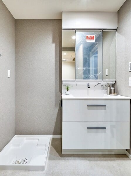 ベージュのタイルが上品に映える、ホテルライクなパウダールーム。洗面化粧台のワイドカウンターの左側には余白スペースがあり、メイク道具やスキンケア用品をゆったり広げて身支度を楽しめますよ✧