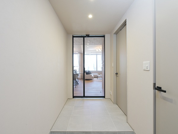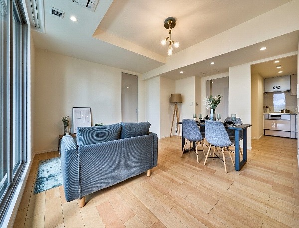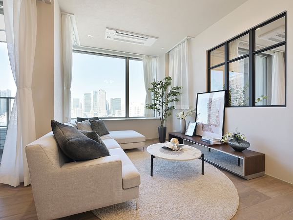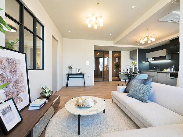 メインルームは約18.6帖。南西角住戸ならではの2面採光で、やわらかな光が室内に広がります。ホワイト基調の内装に、ブラックの室内窓がアクセントとして効いたお洒落な空間。家具をゆったり配置して、くつろぎの時間を楽しむ暮らしが似合いそう♥