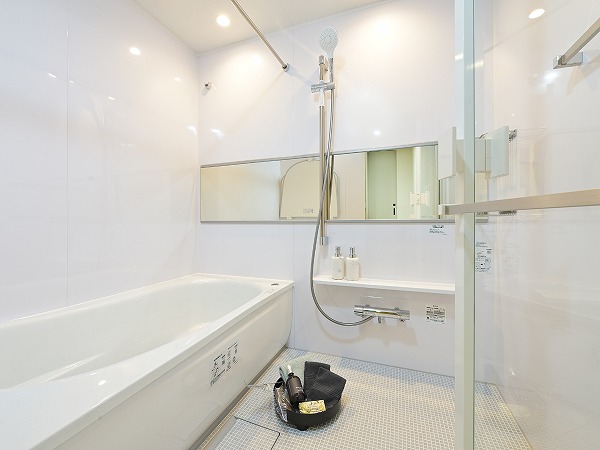 木目の質感が心を和ませるバスルームは、1日の終わりにぴったり。洗い場にはカウンターやミラーが設けられ、使い勝手も良好です。ボトル類を床に置かずに済むため、お掃除もしやすい設計。追い焚き機能付きのバスタブでいつでも快適な湯温を楽しめます。