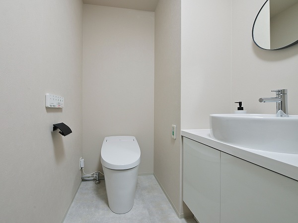 トイレスペースは洗練されたデザインで、清潔感のある印象。温水洗浄付き便座を採用しており、寒い時期でも快適に使用できます。手洗いカウンター付きのため来客時も使いやすく、カウンターに小物を飾って空間を彩るのもいいですね♪