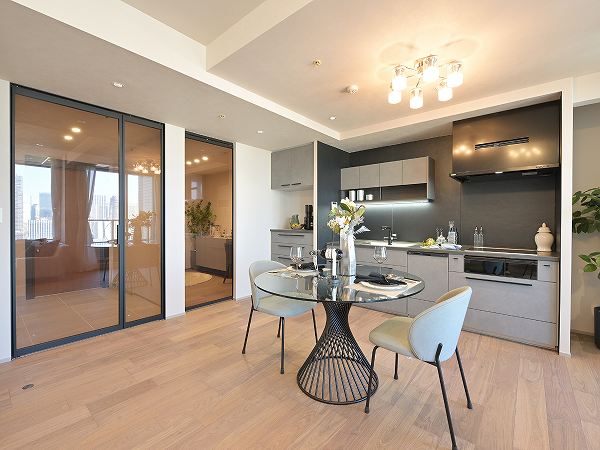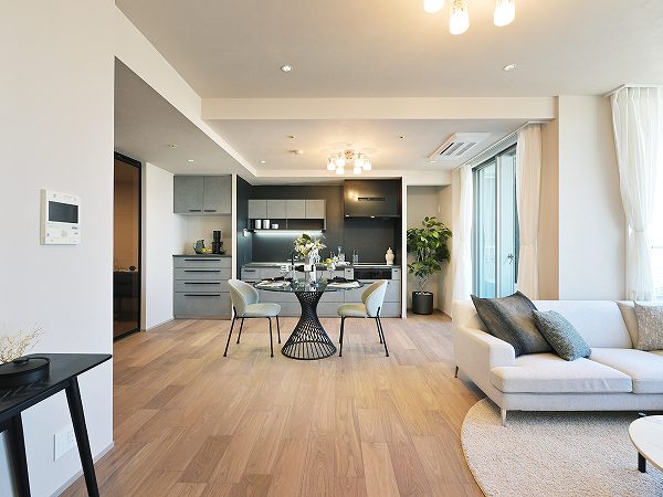 今回ご紹介するのは「ライトウィング」3階部分に位置する2LDK住戸。専有面積は68.80㎡と、ご夫婦やゆとりを重視した2人暮らしにちょうど良いサイズ感です。新規フルリノベーションが施され、室内は柔らかな木目調フローリングとホワイトクロスを基調としたシンプルで洗練された空間に一新されています。折り上げ天井が視線を上へと導き、実際の広さ以上に開放感を感じられるのも印象的。さらに床暖房も備わっており季節を問わず快適に過ごせそう◎LDKに隣接した約5.4帖の洋室は、大きなスライドドアで仕切られており、開け放てばリビングと一体感のある空間に、閉めれば落ち着いたプライベートルームとして活用できます。バルコニーからは、緑の潤いと都会的なビル群が調和した眺めが広がり、遮る建物が少ないため陽当りも良好。